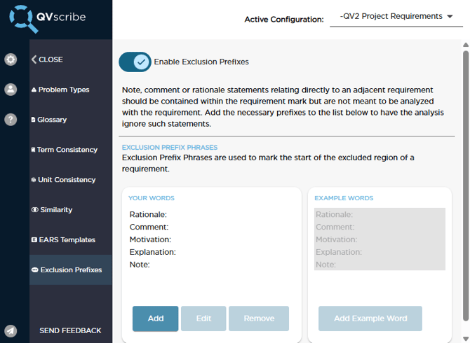 Learn how to use Exclusion Prefixes in QVscribe to ignore notes, comments, or contextual text so they do not affect requirement quality analysis.