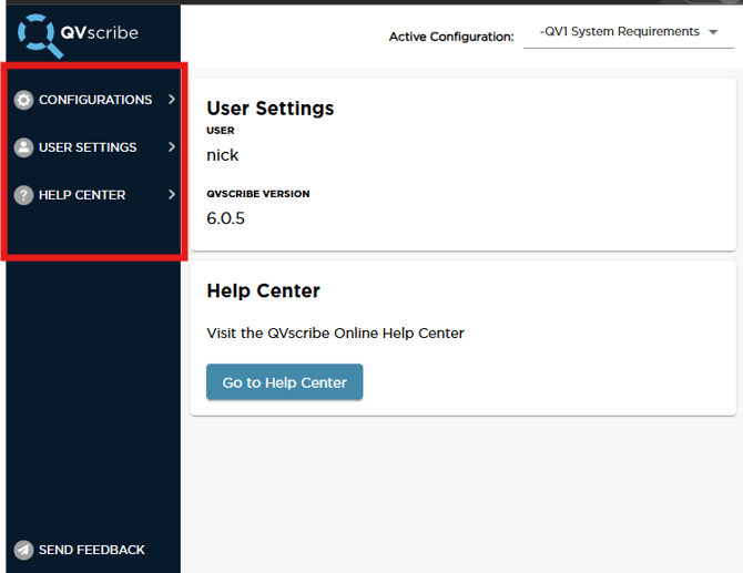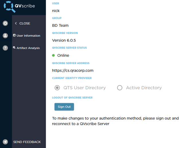 The QVscribe extension window will open, displaying the current configuration and user information.