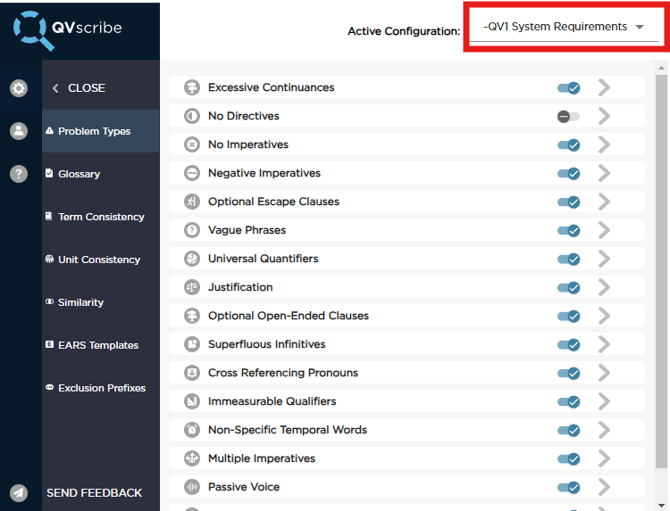 Selecting a configuration will apply that configuration to the QVscribe analysis.