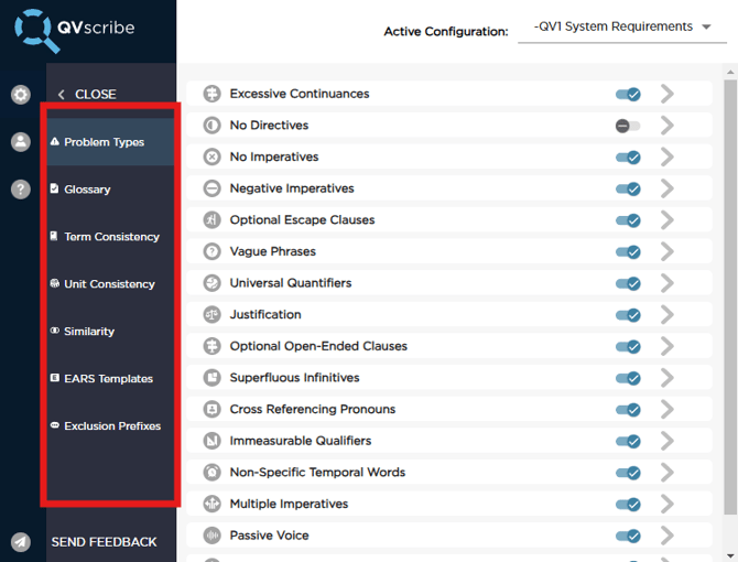 The Problem Types section allows configuration authors to customize the types of language issues detected during requirement analysis.