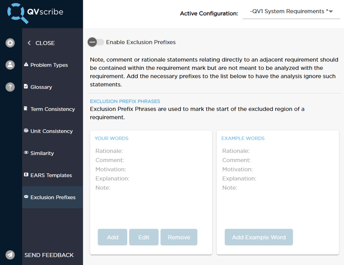 The Exclusion Prefixes setting allows configuration authors to define prefixes that mark text to be ignored by QVscribe during analysis.