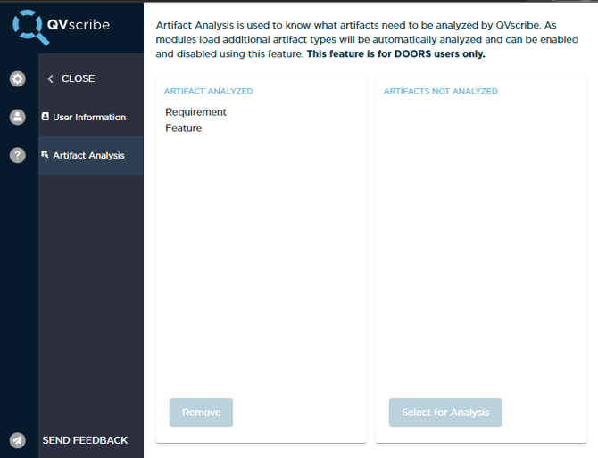 Within User Settings, QVscribe provides Artifact Analysis settings specific to DOORS Next.