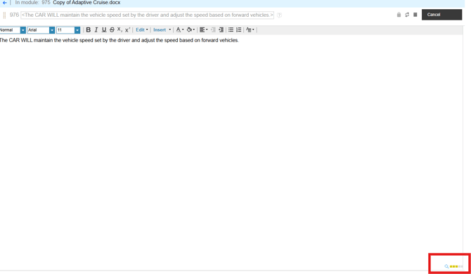 While viewing a module with QVscribe for DOORS Next installed, when “Edit mode” is active for a specific artifact, the QVscribe icon will be displayed.