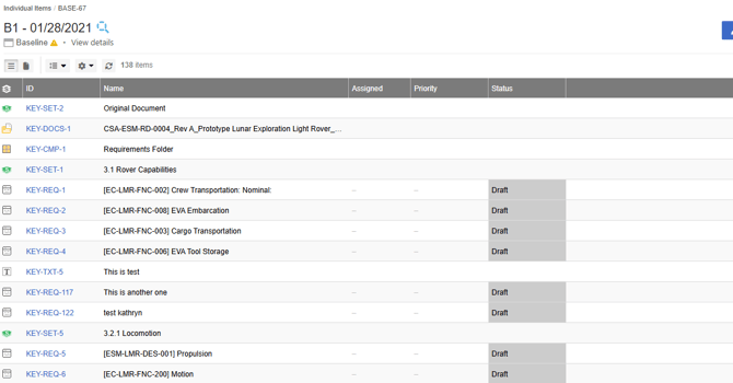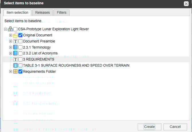 To create a Baseline, select the items you want to be included in the Baseline. You can also use a filter and select a specific release for your Baseline as well.